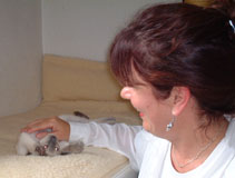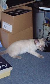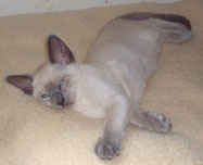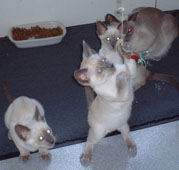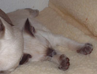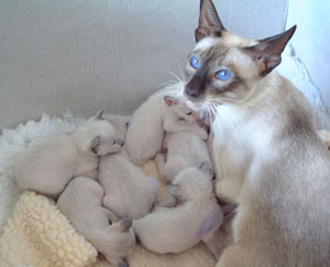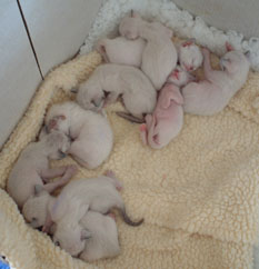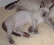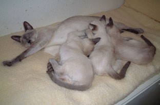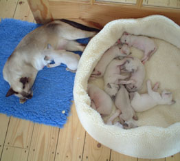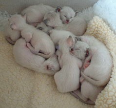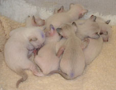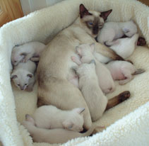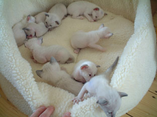 | The little one who wasn't doing so well has picked up superbly following his antibiotic and is now thriving again - even putting on twice the weight of the other kittens to make up for his temporary setback. When I commented to my vet that I couldn't understand why this kitten had apparently got ill with no real cause, he said he wasn't surprised at all, as it was Siamese. He also said that he thought it was a miracle I still have nine babies. I told him that the reason I'm breeding old-style (apart from preferring the look of them) is that they're supposed to be far less difficult to breed than the more showy types, and I don't believe that Siamese are more sickly than other breeds. I know he was just winding me up, but I find I'm very sensitive about this litter as I'm determined that all nine should make it now that they've got this far. The next big hurdle is the 3-week mark, when any kitten with a heart problem will fade as it will outgrow the heart. I don't see any signs of this but it can happen very unexpectedly so I'm not relaxing yet. | ![]() |