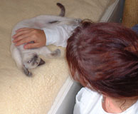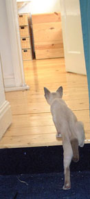 Vaccinations went without a hitch yesterday (and Katy's neck was fine!). However the vet can hear a very slight heart murmur with Dudley. He expects this to disappear by the time of his booster jab, and I gather this is not uncommon in young animals. At any rate there's no outward sign that Dudley feels any different from the others - I don't think he'd be aware of it - and the chances are it will clear up before he's ready to go. |