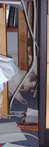 | Having kittens is like having small toddlers in the house - you think everything is safe and then someone will turn some perfectly innocent piece of furniture into a death-trap. A couple of days ago a friend found that one of her kittens had crawled up the outlet hose from her tumble-drier into the inside of the machine. She only knew he was there because the mother was trying desperately to get him out by crooning up the hose! That could have been a really nasty disaster, and she's thanking the cat gods that she found him in time. I'm also thanking the cat gods that I was in the house when this happened, as if she'd been left for half an hour I don't think she would have survived. I sat beside her for an hour after this to make sure that her throat didn't swell and asphixyate her, but there were no after-effects to see. They will all be going to the vet for their first vaccinations this afternoon, so I will ask the vet check her over just in case. Here she is beside the scene of the crime (the heater is pulled out now!). | ![]() |
