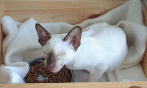 Refill biscuit bowl and water for Tonkinese, and put out chicken