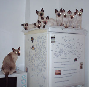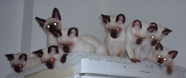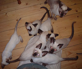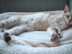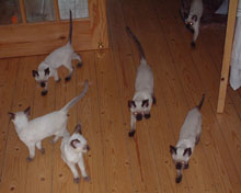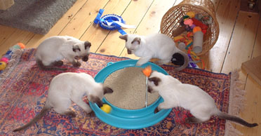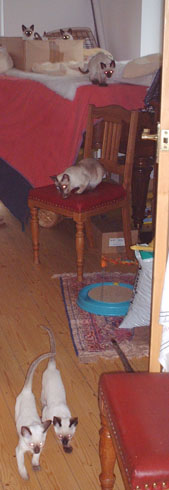 Peter Padfoot (the biggest of them all) is the funniest - he has learned how to zip out of a door as soon as it is opened, so he has had a few alarming encounters with Teddy the Tonkinese, though that doesn't seem to have stopped him. He's desperate for cuddles and just goes all soppy and purry when I pick him up. If I sit down he's the first (or sometimes the second) to make himself comfortable on even a sloping lap. I'm getting besotted with him, and that's hopeless. I can't understand why he hasn't been 'chosen' yet, but maybe he is just attached to me and isn't interested in anyone else. I haven't had any calls from prospective homes for quite a few weeks, but as you can imagine, I'm not pushing! |