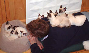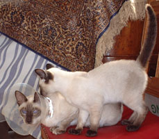 She seems to meow and stay awake a lot of the night... did she do this with you... maybe she isn't that tired as she has slept during the day... although not sure whether its the dark she doesn't like... have tried to put her on my bed and stroke her... she stays for a couple of minutes then goes back under the bed.... when she is confident and I have picked her up, she does seem to like having her head kissed a lot as if I stop she puts her head up towards me until I kiss her again... this is quite sweet and she can be really affectionate, but it's not normally for very long, but I hope as she gets more confident and trusts me she will get more comfortable with me and her surroundings, she is such a beautiful looking cat and too lovely to hide away... I am hoping she will eventually come and sit on my lap of her own accord and stay in the lounge and follow me around.... I'm sure it will take her some weeks or maybe even more to get used to everything... I am just a little worried that she will keep hiding under the bed and never come out. |