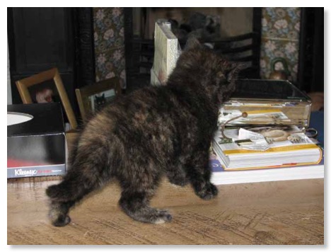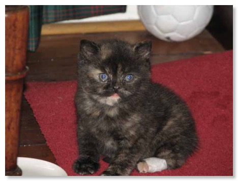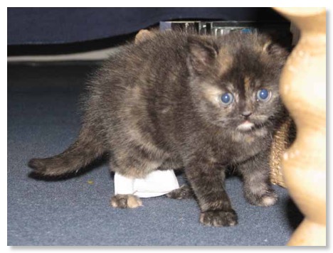 We kept the tape on for about a week and she is now walking and running fairly normally and is a playful 'normal' kitten. Whether Pogle will have future respiratory problems only time will tell but for the moment she is a delight to have around and we are really glad that we decided not to follow the vet's initial advice.
