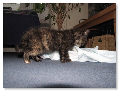 At first we taped the legs a little too closely together and the kitten had difficulty balancing - we then tried the legs slightly further apart and the kitten seemed to tolerate this much better and was able to get about quite well. With the tape around her legs, the kitten took little steps whilst walking slowly but moved both legs together when she ran.