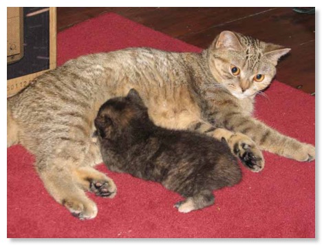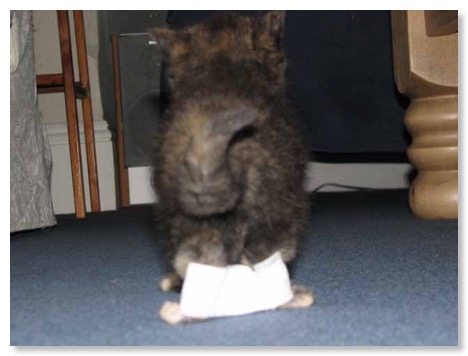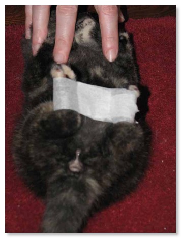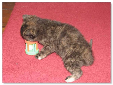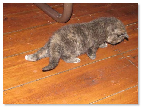 Pogle was one of a litter of three - the other two kittens did not survive and we had become very attached to her so we decided not to make a decision immediately but to see how she went on over the next few weeks. We searched on the internet for both conditions and discovered that cats with FCKS that is not too severe can live perfectly normal lives. Swimmer kittens have also been treated with some success. A vet at the practice was good enough to send us some information on 'swimmer kittens' that they had found which recommended binding the kittens back legs together and performing daily physio.