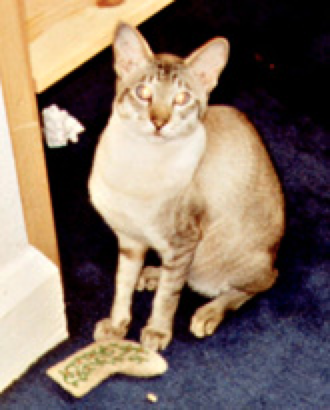 One sunny afternoon, I was sitting in my study and was dusturbed by a strange 'shuffling' noise. It was Humbug (he was a dark Seal Tabby Point, so what else could I call him?) dragging his fleece from his room into my bedroom. A few minutes later he went back and dragged the cuddly toy through, and over the course of about an hour, all his toys, especially the swimming goggles (clackety-clack across the floor) were also moved. I think his possessions, the first he had ever had, also gave him a sense of security, and from then on whenever he moved, or whenever I had to move him, all his belongings went with him, the swimming goggles were always first though-perhaps these had a special place in his heart as all the other things had been given to him, but this was something he had found for himself and 'stolen' during an adventurous exploration in my bedroom.