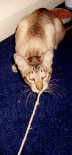 There was a pile of toys and other interesting bits and pieces in his room, but he didn't touch any of them because he just didn't know what they were for. A big breakthrough in encouraging him to move towards me was with string: about 5 days of flicking it towards his nose and dragging it away, done from the opposite side of the room, and with him completely unable to decide what to do about it. The first time he went for it, his long limbs were so surprised that he catapulted across the room, doing somersaults: he had never learned to play, so had never learned to co-ordinate his legs! However, over several days, he learned, until he would go and sit by the string when I went into his room. Interactive play is very unthreatening, and distracts the cat from worrying solely about how close you are, or what you might be about to do next. By distracting him with play, he gradually allowed himself to get closer to me, though usually when he realised how close he had got, he backed off again very quickly. However, each time he found himself 'too close' to me, it taught him that nothing horrible happened, so it gradually had an impact.