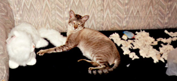 I have rescued several quite normal cats who just lost their owners through bad luck (or boredom on the first owner's part), but I have had one unforgettable experience with rescuing a disturbed cat. He was a five-year old Siamese who had good reason to be scared out of his wits! He had been returned to his very elderly breeder two weeks after being sold as a kitten because he had jammed himself, terrified, behind a wardrobe and wouldn't come out for anything. For some reason the breeder didn't neuter him when she took him back, but kept him entire and shut him into a completely empty room at the top of the house. The old man went in once a day to feed him, keeping him away from the door with his walking stick.